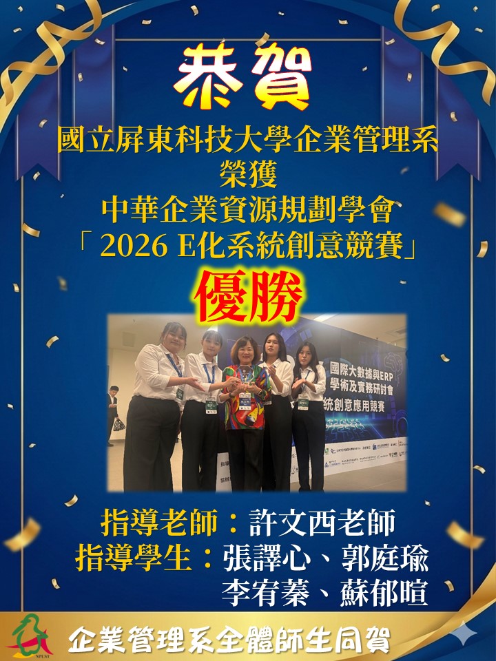 恭賀本系許文西老師指導張譯心、郭庭瑜、李宥蓁、蘇郁暄榮獲中華企業資源規劃學會舉辦「 2026 E化系統創意競賽」優勝