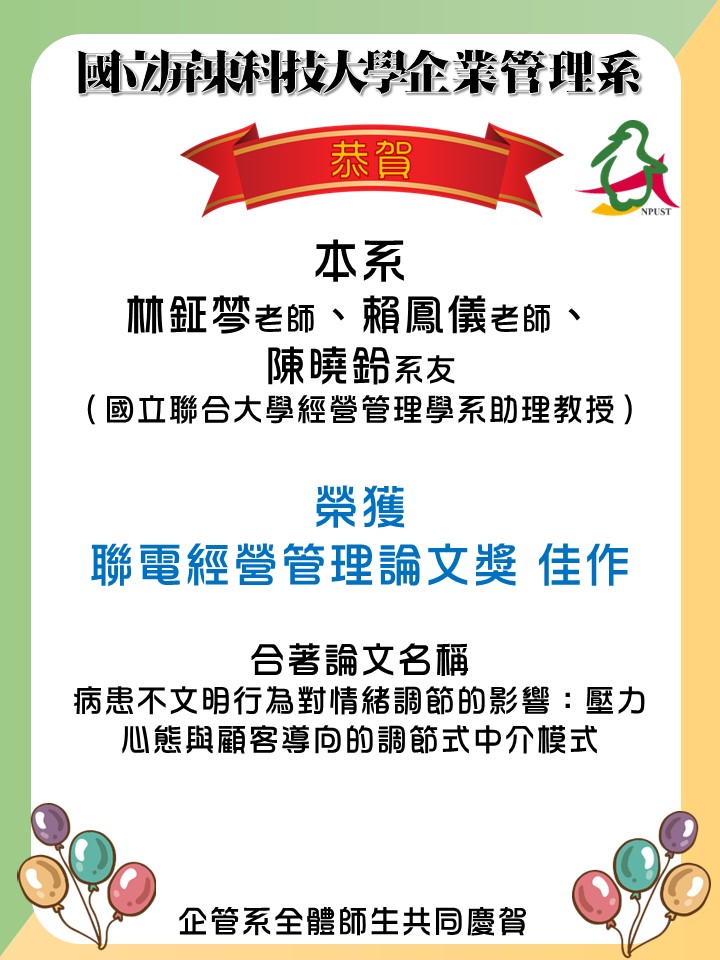 本系林鉦棽老師、賴鳳儀老師及陳曉鈴系友合著論文,榮獲 聯電經營管理論文獎 佳作