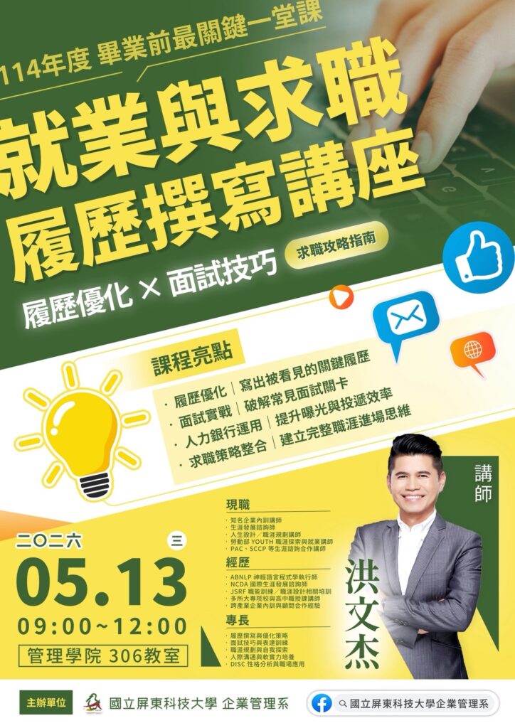 114學年度畢業前最關鍵一堂課「就業與求職履歷撰寫講座」-履歷優化×面試技巧求職攻略指南。5月13日9:00~12:00,地點:管院CM306。